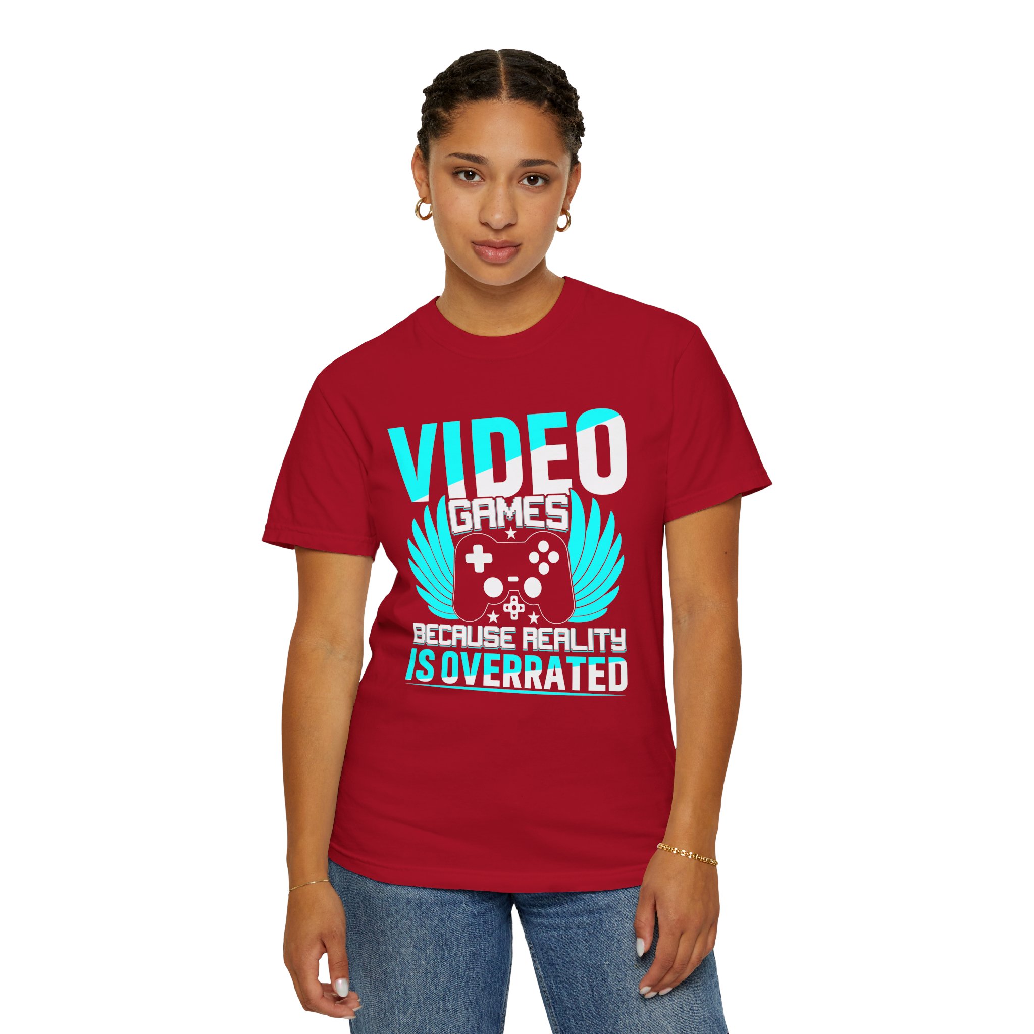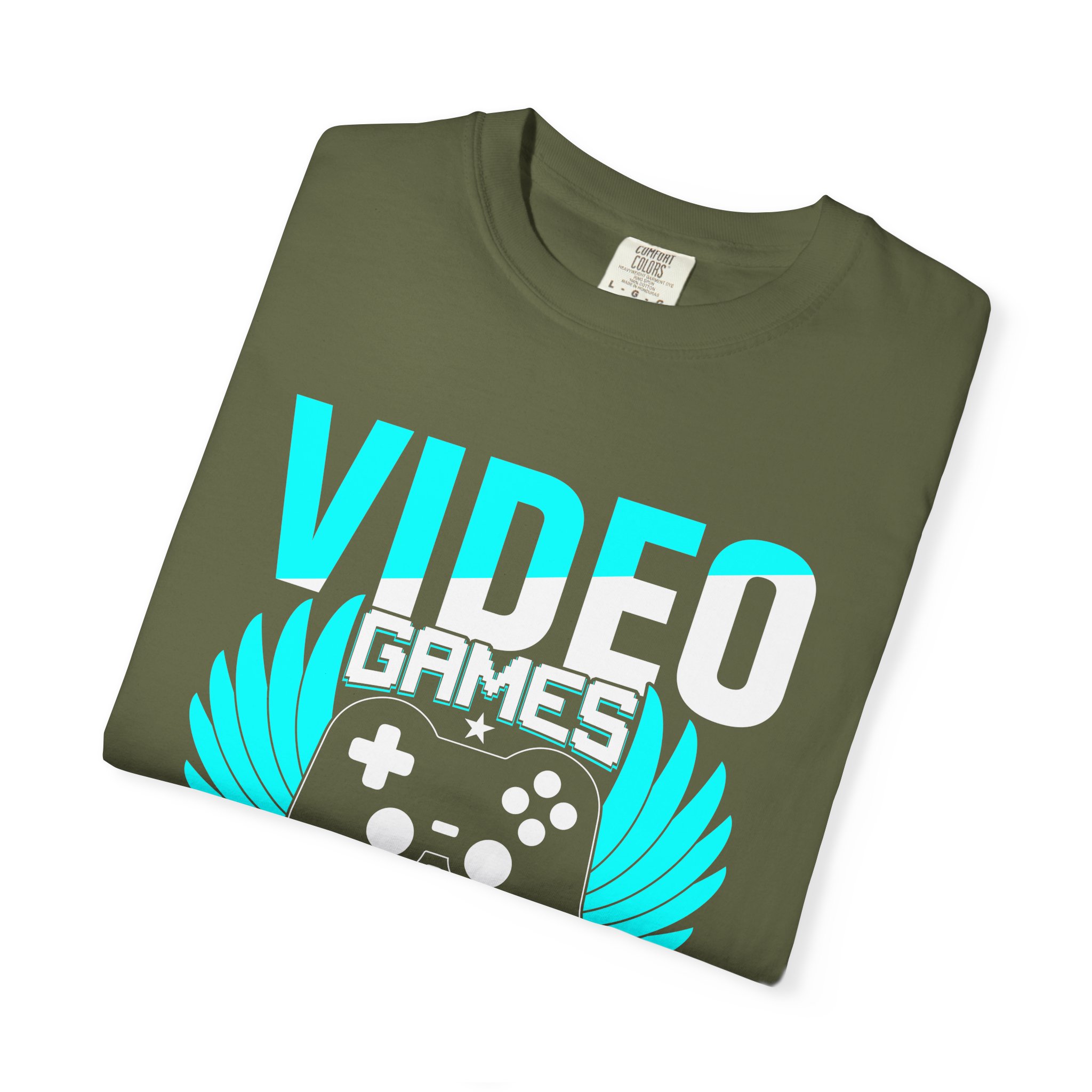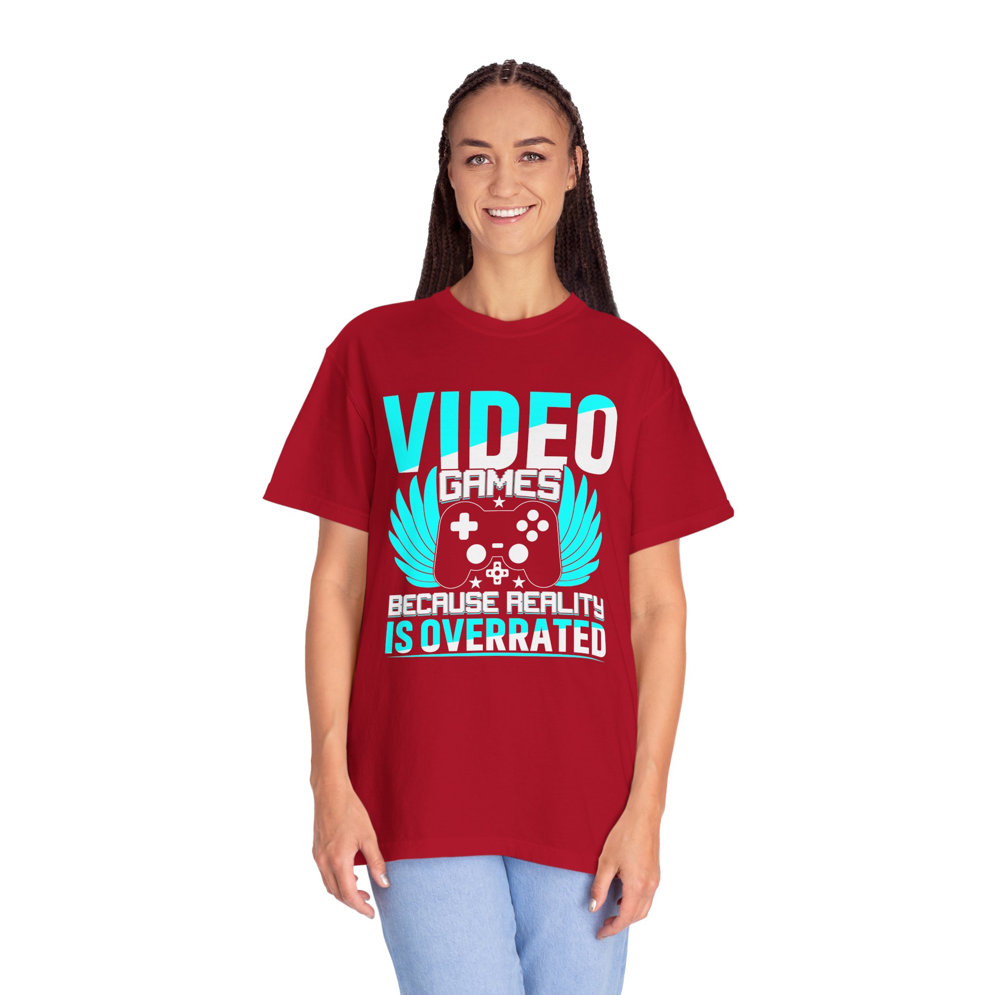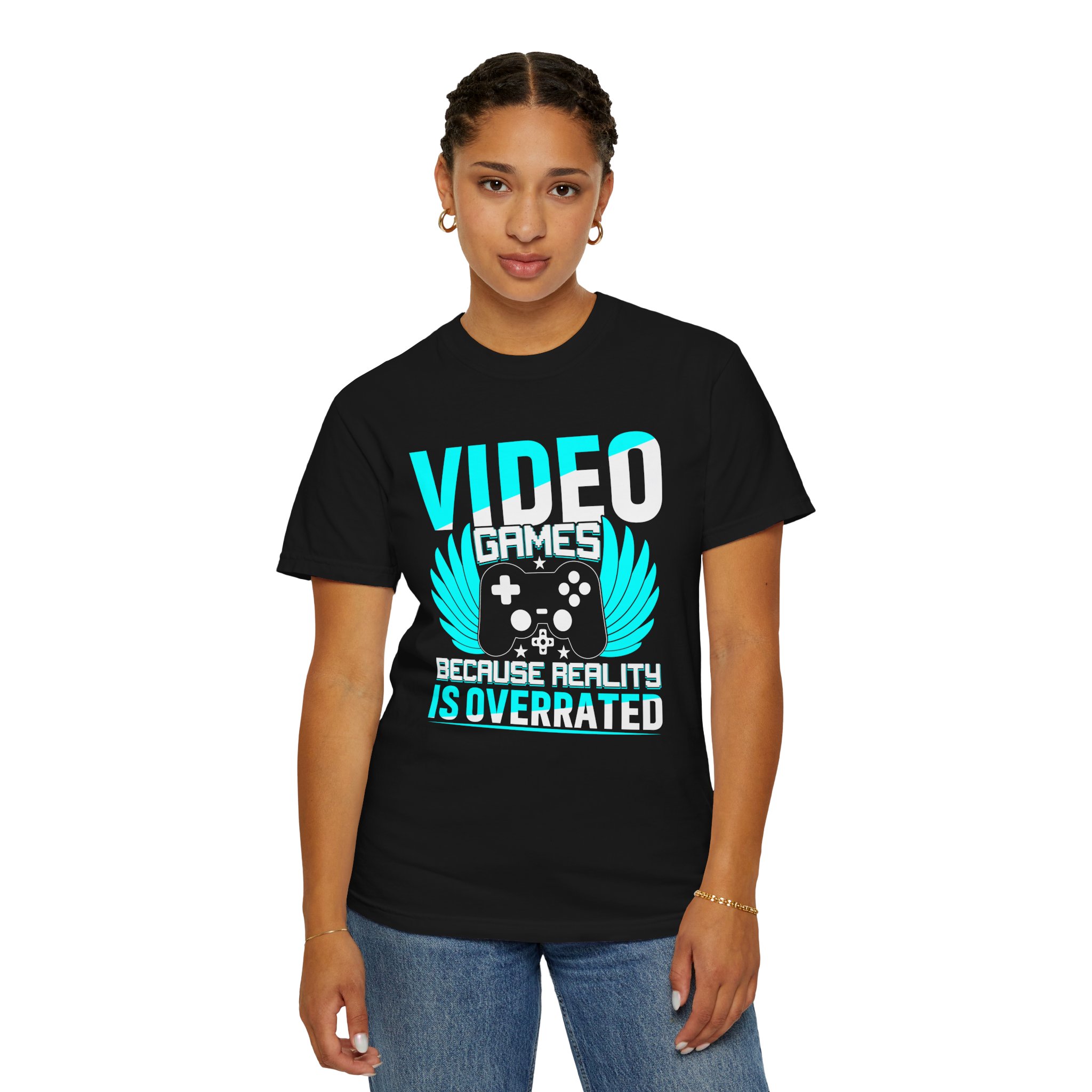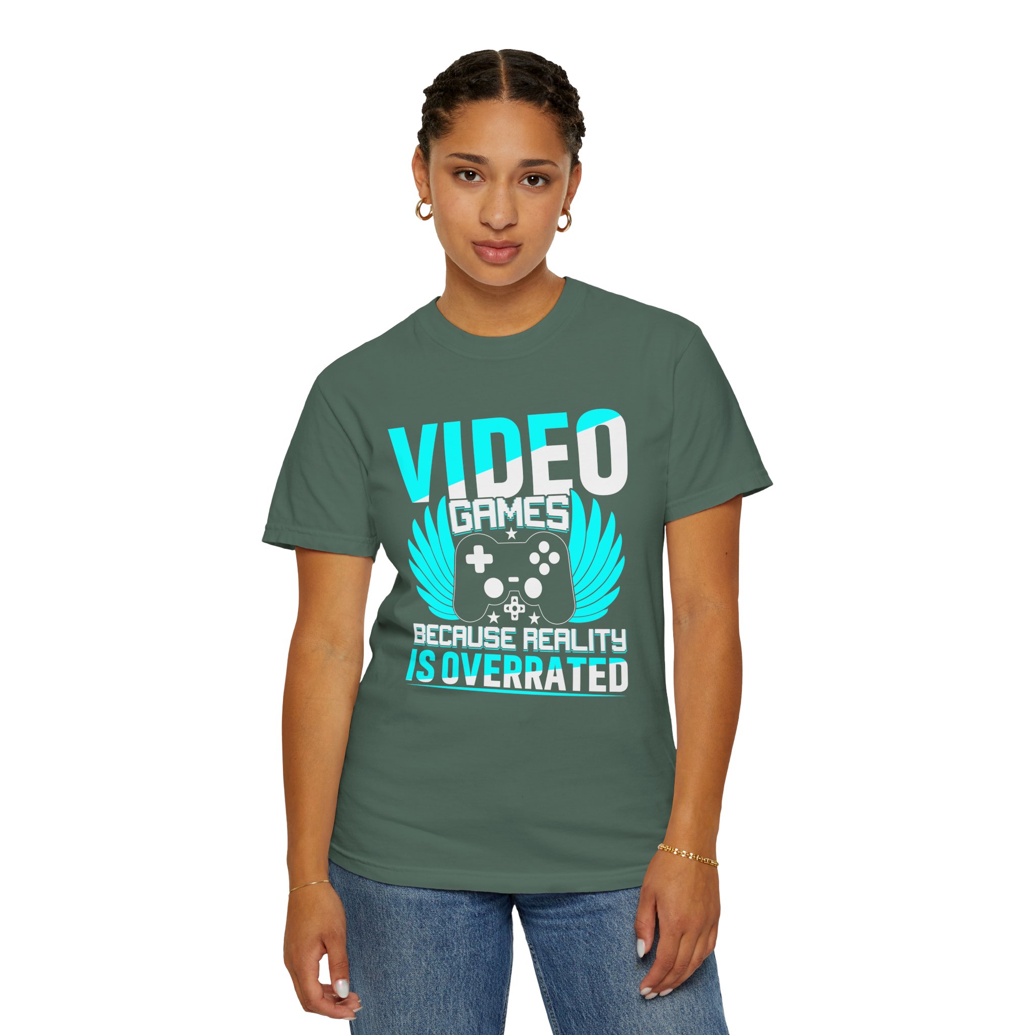 This heavyweight, garment-dyed tee brings gamer pride into everyday life with a soft, lived-in feel. The bold front art — a stylized controller with wings and the line “Video Games — Because Reality Is Overrated” — reads like a badge of belonging. Wear it to LAN nights, streaming sessions, or lazy weekends spent leveling up; the relaxed fit and durable construction keep you comfortable through long play sessions and countless washes. The muted, vintage-y color from garment dyeing pairs with the bright cyan print for a striking contrast that still feels familiar and worn-in. Built to last with double-needle seams and pre-shrunk ring-spun cotton, this shirt ages into your go-to layer for chill meetups, conventions, and cozy at-home marathons.