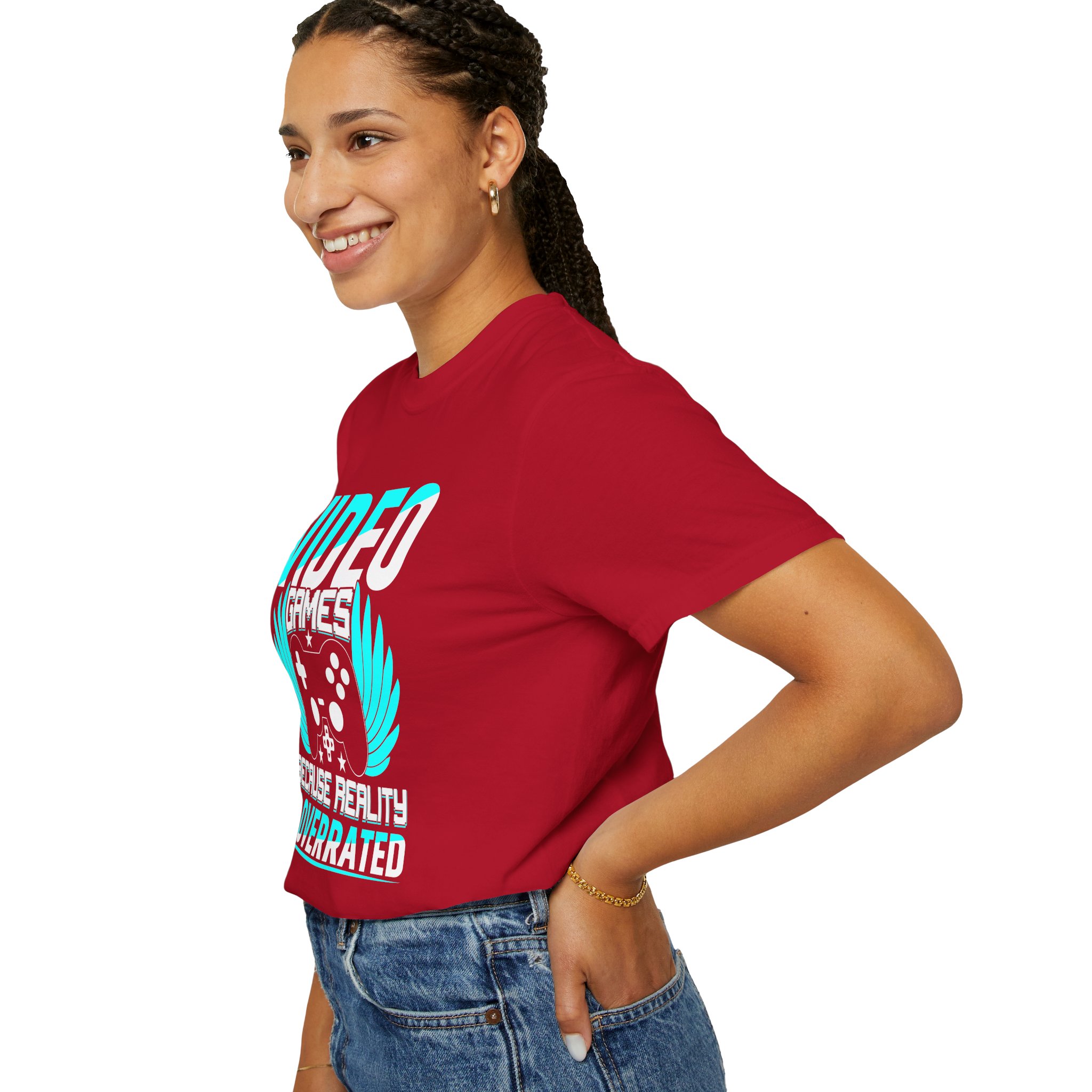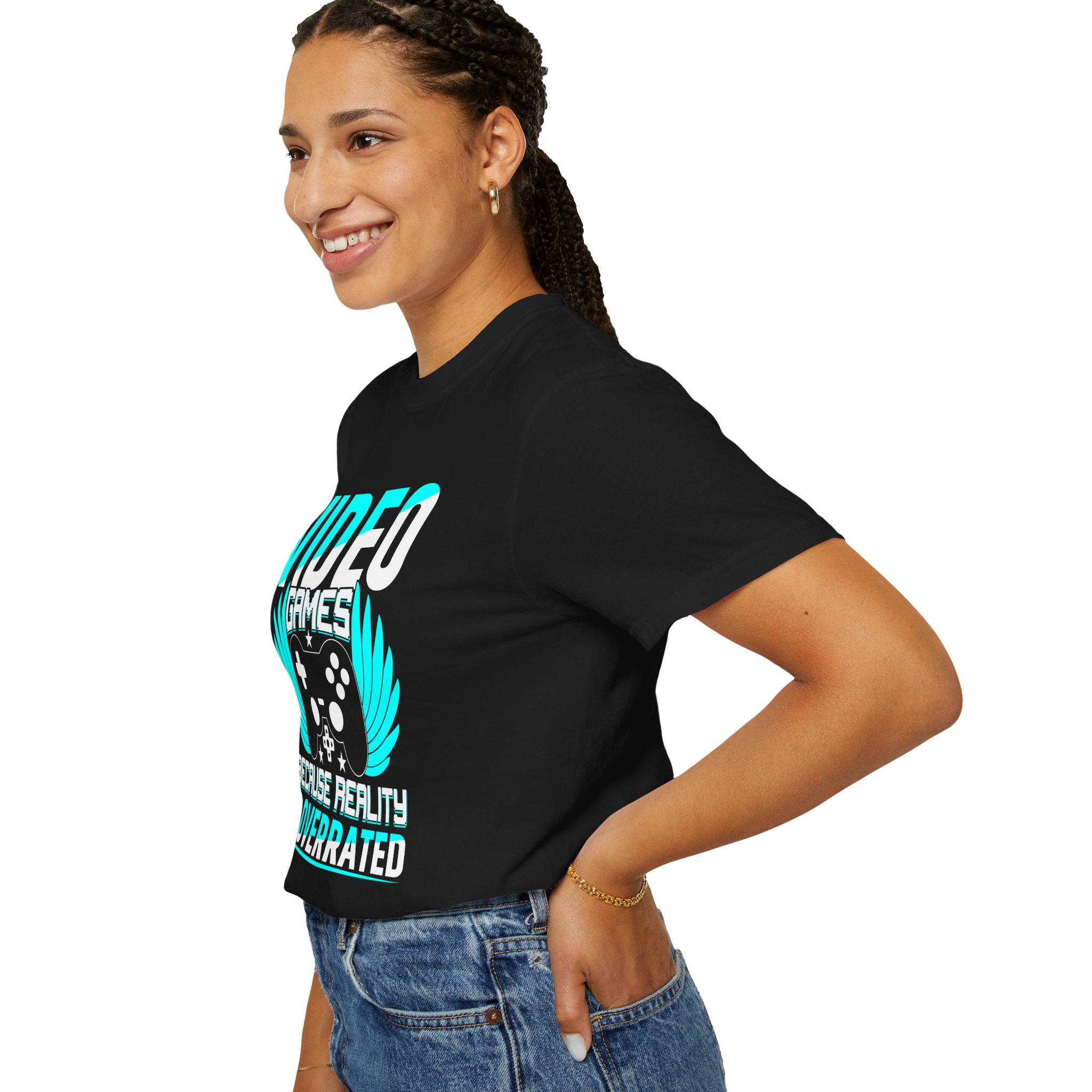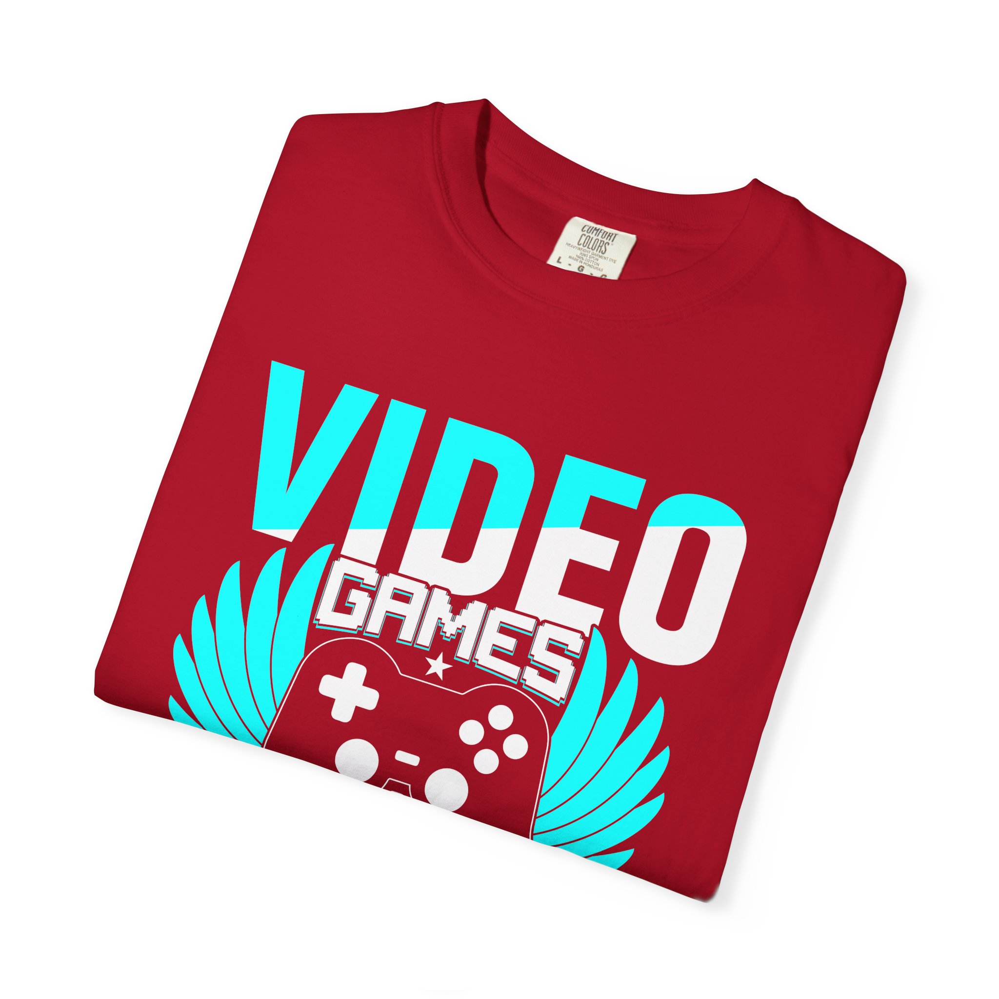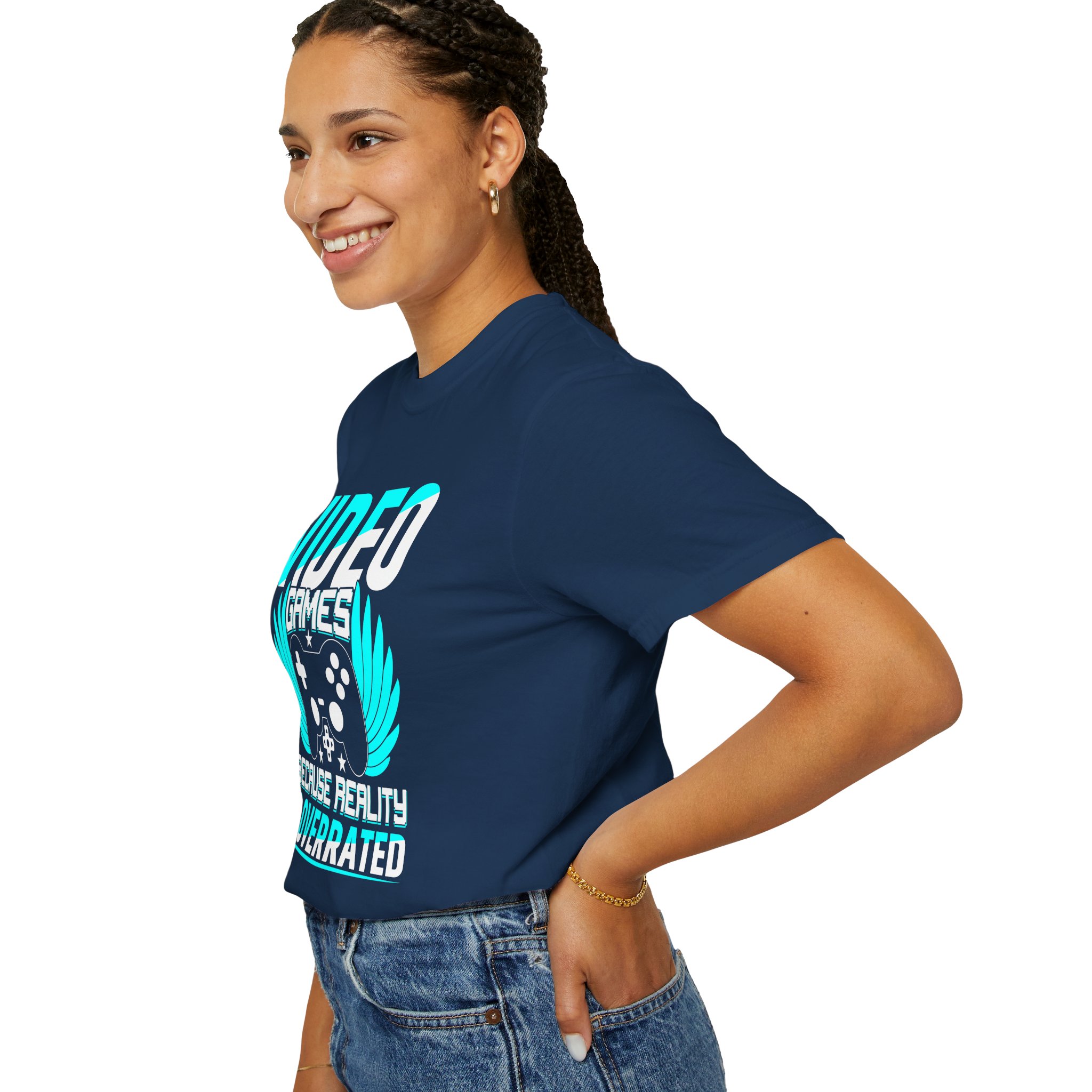 This heavyweight, garment-dyed tee brings gamer pride into everyday life with a soft, lived-in feel. The bold front art — a stylized controller with wings and the line “Video Games — Because Reality Is Overrated” — reads like a badge of belonging. Wear it to LAN nights, streaming sessions, or lazy weekends spent leveling up; the relaxed fit and durable construction keep you comfortable through long play sessions and countless washes. The muted, vintage-y color from garment dyeing pairs with the bright cyan print for a striking contrast that still feels familiar and worn-in. Built to last with double-needle seams and pre-shrunk ring-spun cotton, this shirt ages into your go-to layer for chill meetups, conventions, and cozy at-home marathons.